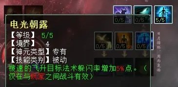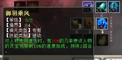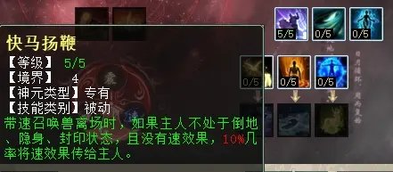“速”天赋第四层三个技能,分别是:快马扬鞭(任务、PK通用,带速的BB离场可将速传给主人),御羽乘风(任务、PK通用,灵宝也可获得速度加成),电光朝露(PK专用,被速的单位增加法术躲闪率)。建议优先选择“电光朝露”,其次是“御羽乘风”,“快马扬鞭”触发条件太苛刻,用处不大。