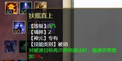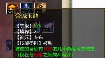 “速”天赋第二层三个技能,分别是:金城玉池(PK专用,被速的单位几率免疫灵宝伤害),扶摇直上(任务、PK通用,再速被速的单位可增加强速效果),兵贵神速(任务、PK通用,3法速几率速6)。“金城玉池”为必选,“扶摇直上”可针对打敏队时使用,“兵贵神速”可针对打血队时使用,遭遇战时无法得知对手是敏是血,可闭眼选“兵贵神速”。