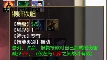 “速”天赋第一层三个技能,分别是:铜肝铁胆(PK专用,减少悬刃、讨命、报复对自己的伤害),疾风劲草(任务、PK通用,4法速效果增强),意犹未尽(任务、PK通用,5法速减少耗蓝)。因为4法用的少,所以我们优先选择“铜肝铁胆”和“意犹未尽”。