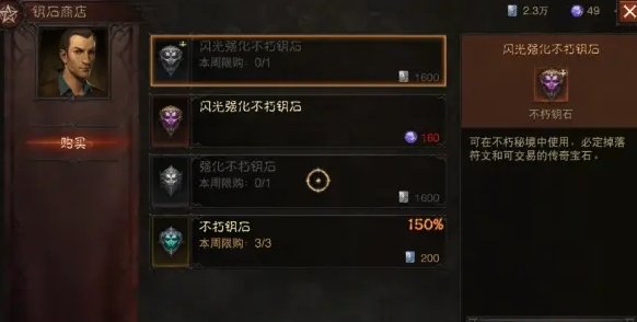 在钥石商店我们要理性一波,觉得普通玩家不要去买1600的强化不朽钥匙,因为你正在缺宝石能量1600白金币可以在拍卖行买3个传奇宝石了。而闪光强化不朽钥匙可以买来赌一赌,毕竟1600大不了出个1星宝石亏1100,但是出了2星宝石就赚了,出了2/5星以上的可交易的宝石血赚,所以大家仁者见仁智者见智吧!