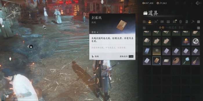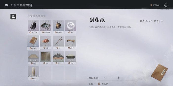 未获取藤纸的少侠请前往勾栏瓦肆的王家木器什物铺进行购买,位置及藤纸价格可参考下方图四、图五及图六。