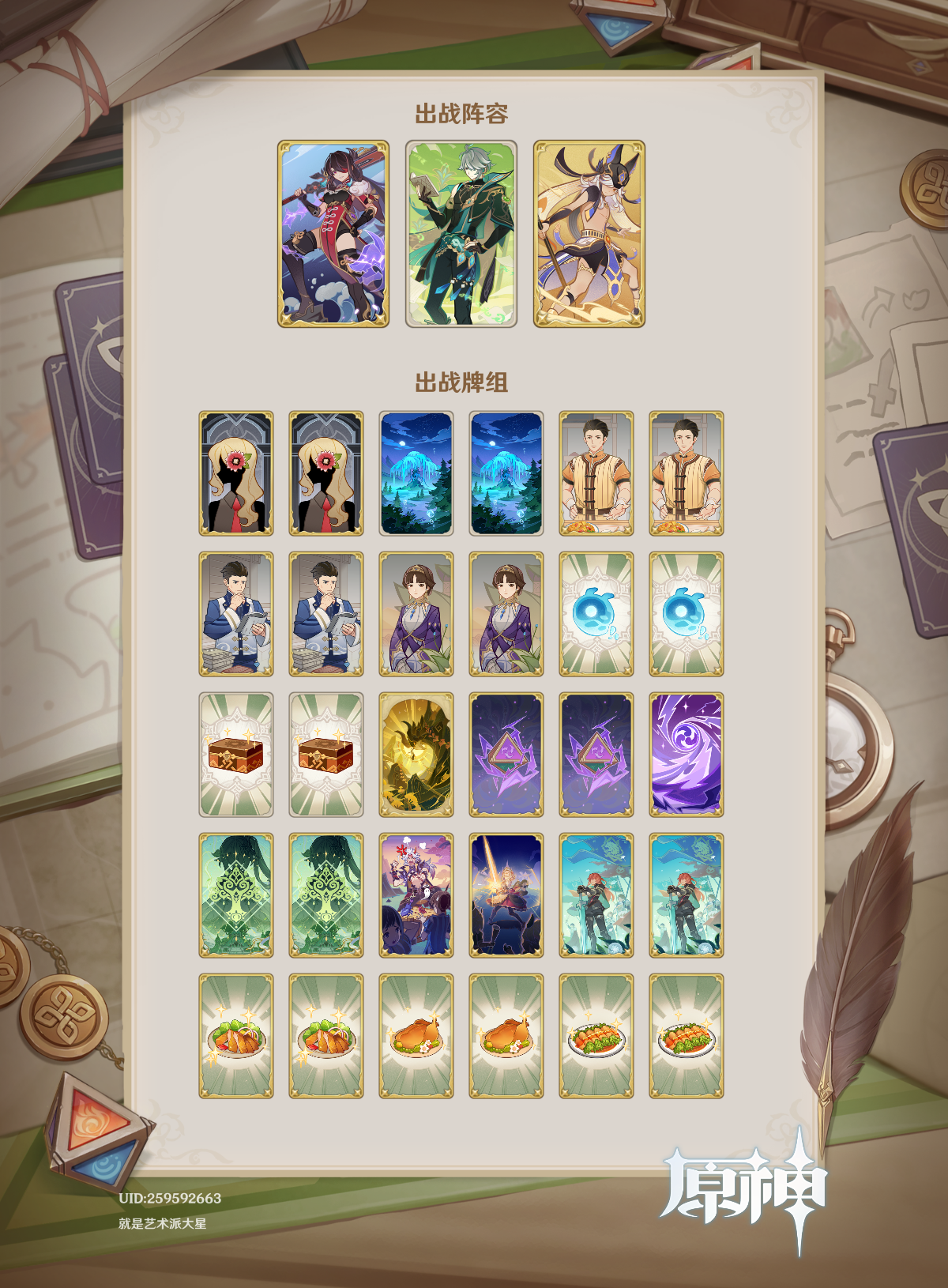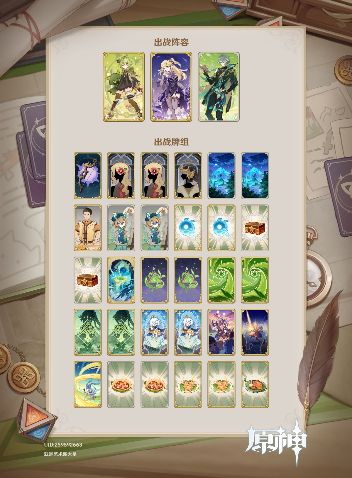4.3版本百花齐放,环境混沌,目前表现较好的新卡组主要是以饰金之梦为核心的三色快攻,包含若陀龙王,女士雷音权现等,以及五郎双岩这个版本三色队简直就是三体人,圣遗物体系配合琴音饰金能凭空变出大量的骰子,让人防不胜防。