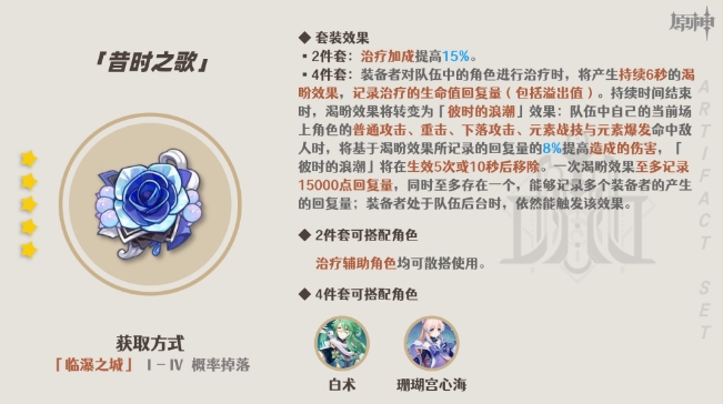 目前能够搭配「昔时之歌」4件套的治疗角色并不多,且与「海染砗磲」相比没有悬殊很大的优势,在选取中推荐谨慎选择(当前仅心海、白术可考虑使用)。但对于已有海染砗磲4件套搭配的治疗角色而言,并没有太大的必要专门再刷取一套昔时之歌。该套装所适配的队伍更多是“M伤害区间乘积”极高的队伍。