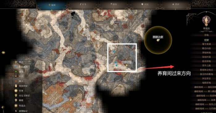 接着我们可以跳到对面的路,同时这里解锁了传送点蔽影战场。蔽影战场这片区域朝东是养育间过来的方向