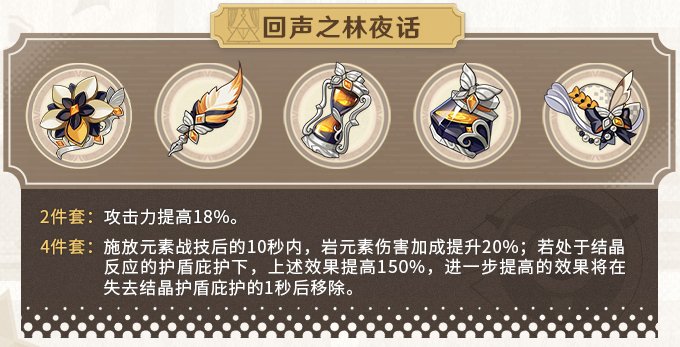 四件套效果在有结晶盾的情况下岩伤加成给到50%,比一个岩伤杯子还要高,二件套还是攻击力提高,这套妥妥的就是给以攻击力提升伤害为主的角色使用的,比如新角色娜维娅和开服角色凝光。