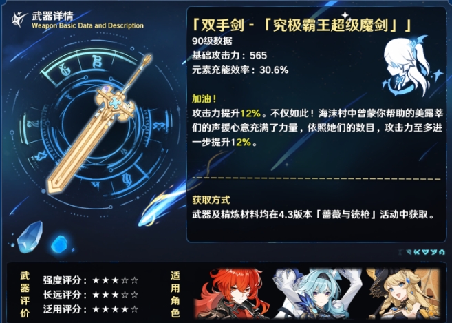 「究极霸王超级魔剑」90级基础攻击力为565,属于四星武器当中白值较高的一档;副属性是30.6%的元素充能效率,被动是朴实无华的攻击力提升。