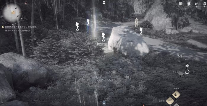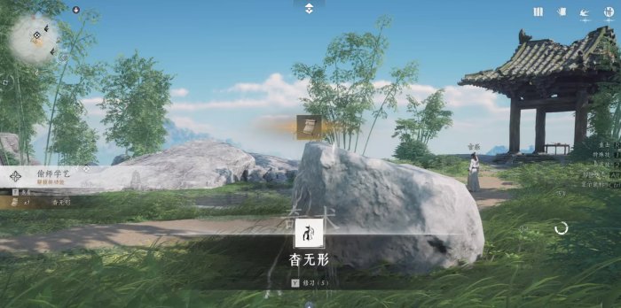 2、打开按【V】键,可以看到最佳偷师位置在石头后面,去该位置就为