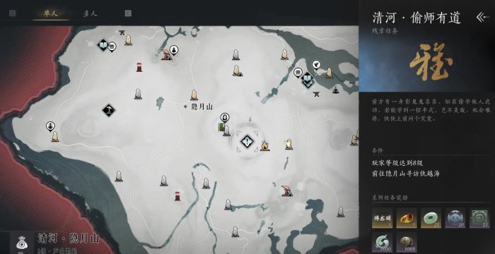 1、前往如图所示位置,与仇越海交流,接取残章任务【清河·偷师有道】