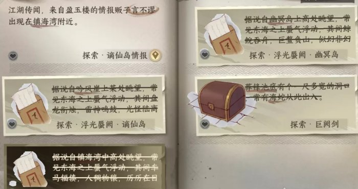 以上三项完成顺序任意,三个传闻全部完成后在当时位置立即出现金宝箱,同时磐蟹洲望气点位消失。 传闻图示。