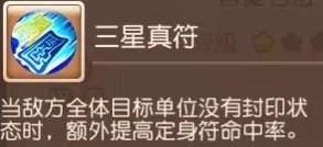 三星菩提祖师,升星效果选择为3个天属性,他的封印命中能达到1665,但一般情况,碍于实际培养状况,给菩提选择三个天属性的玩家不多,姑且视祖师的升星属性为"2天1地",其命中数值可以达到1650,定身玩家可以实现90%成功率,定身三星唐僧能实现82%成功率,外加天脉三星真符效果