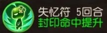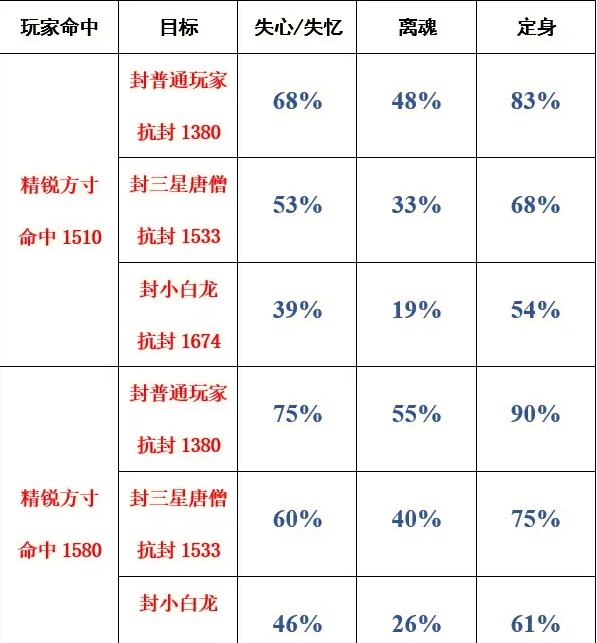 若方寸命中为1580,则可获得:失心符75%成功率、失忆符75%成功率、离魂符55%成功率、定身符90%成功率