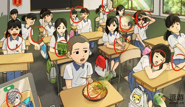 1、疯狂梗传我是班主任,找12处老师不允许行为是:看漫画(滑动平板)、玩手机(滑动窗边女生的书)、吃螺蛳粉、唱歌、带墨镜、超短裙、睡眼惺忪、指甲油、光明正大、交头接耳、反向看书、烈焰红唇