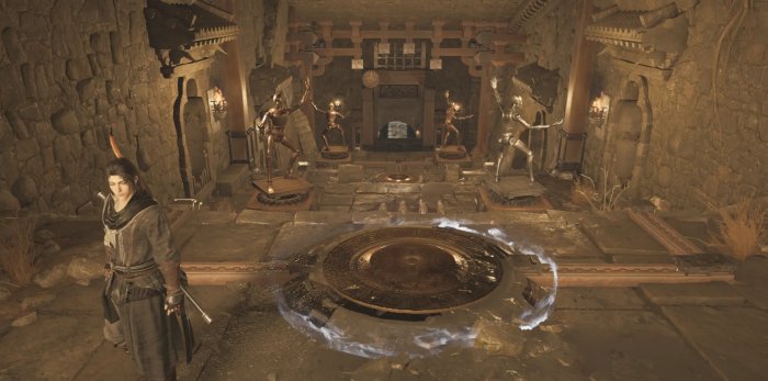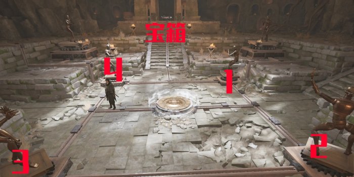 踩上第一个踩踏机关,使前面两个雕像与后面两个雕像一致,完成后离开机关,芝麻开门~
