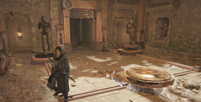 往下走,会看到第二个踩踏机关,踩踏后,此时上下共四个雕像会同时转动,需让下方两个雕像与上方雕像初始状态重合。