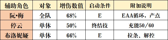 该增伤通过阮梅的战技及行迹3提供,增伤区间飙升至68%。与当前常用的提供增伤乘区的辅助相比(见下图),阮梅的辅助方向与其余同谐辅助有一定路线上的区别,而总体数值与能够产点的循环令人欣喜。