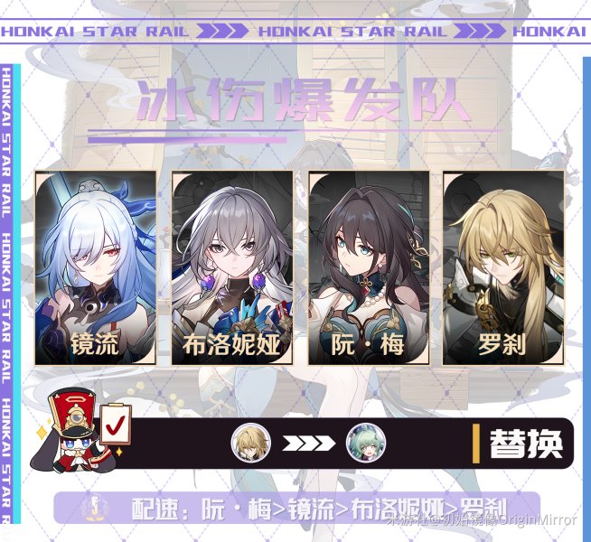 阮梅迭代佩拉使本就强势的冰伤爆发队伍得到了进一步提升,在阮梅削韧加成与布洛妮娅拉条的搭配下,镜流的压制力从一般水准上升到高水准,布洛妮娅与阮梅提供的输出增益加上镜流自身强势的出伤能力,该队伍的爆发能力极强,在敌人具备冰弱的情况下该配队的战斗表现是相当夸张的。