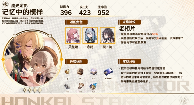 【记忆中的模样】对于阮梅而言是仅次于专属光锥的选择,可以为阮梅提供高额的击破特攻加成和额外回能,让阮梅能够稳定三动一大,提升终结技结界的覆盖率,满叠影记忆对队伍DPR的提升仅仅比专属光锥低6%左右,如果队伍没有战技点压力的话基本可以平替专属光锥。
