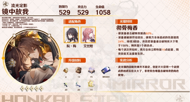 【镜中故我】为阮梅的首选光锥,除了提供高额击破特攻加成外,还具备增伤、回点、回能等功能,装备专属光锥的阮梅在忘却之庭中可以稳定首动开大,直接启动队伍,后续为稳定四动一大,如果想要三动一大则需要三次受击回能。光锥提供的回点可以减轻队伍的战技点压力,阮梅会经常与布洛妮娅组合使用,布洛妮娅专武与阮梅专武双回点会大幅降低点数压力。