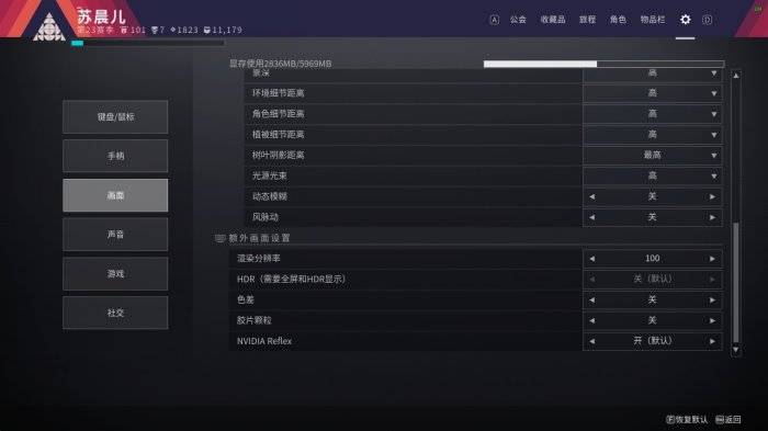 渲染分辨率100左右即可,电脑配置好的可以拉高点,PVP玩家建议调到100,hdr显示看个人显示屏情况,色差和胶皮颗粒,风景玩家建议全开,pvp玩家建议关掉,NVIDIA Reflex一定要开,可以提升性能