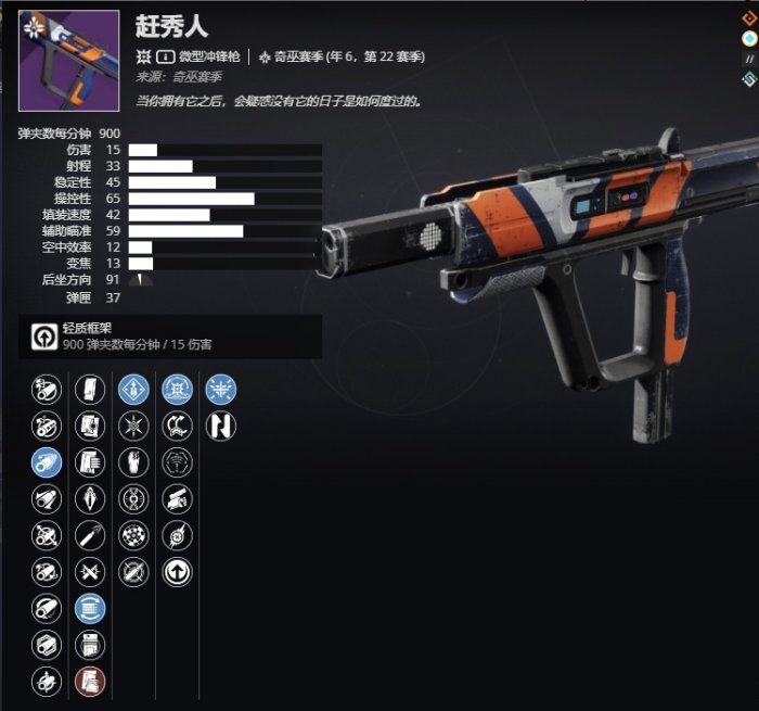 年3老枪,等复刻,动能武器+威胁+腹背,清怪方面适配冲锋枪的交战距离,然后棒鸡再也没有出一把同款900轻框+动能+威胁+腹背的新武器(啊米诺斯)