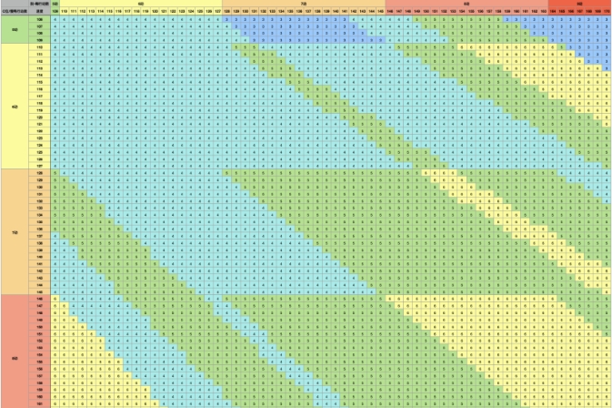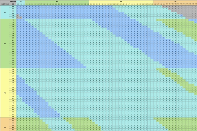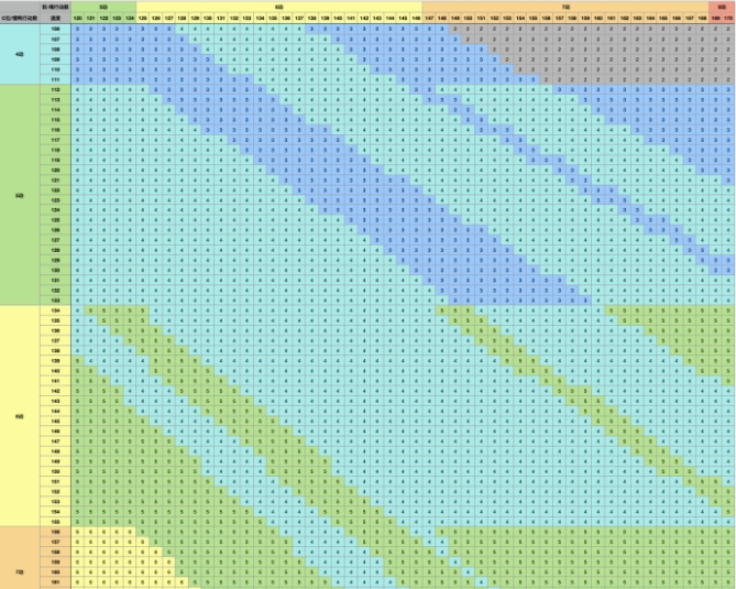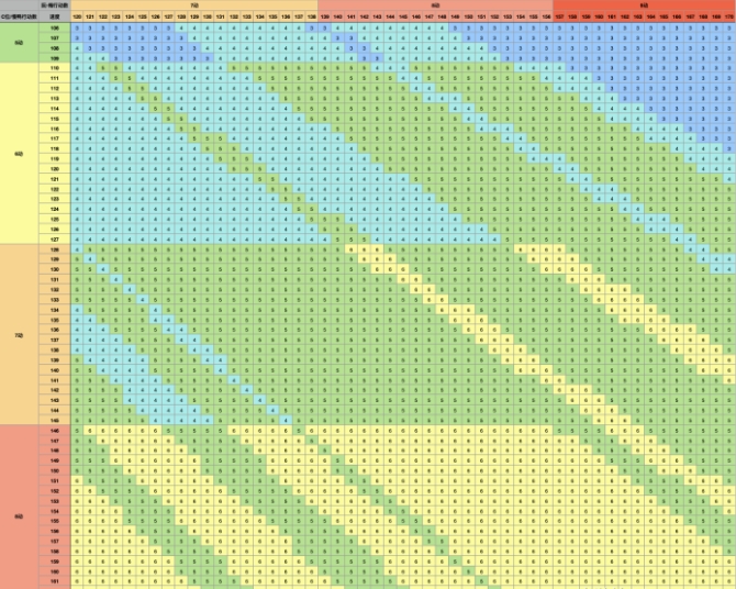 更一般的情况,可以参考下面四张图表中的结果,图表对应了各个速度下,在四或五回合的战斗中,有/无翁瓦克的阮梅终结技穿透buff覆盖C位的行动次数。横坐标为阮梅的速度与对应的行动次数,纵坐标为C位(或慢速鸭)的速度(阮梅天赋加速之后的实际面板速度)与对应的行动次数,而表格中的数字则为该配速下阮梅终结技穿透buff覆盖C位的行动次数(越多越好)。