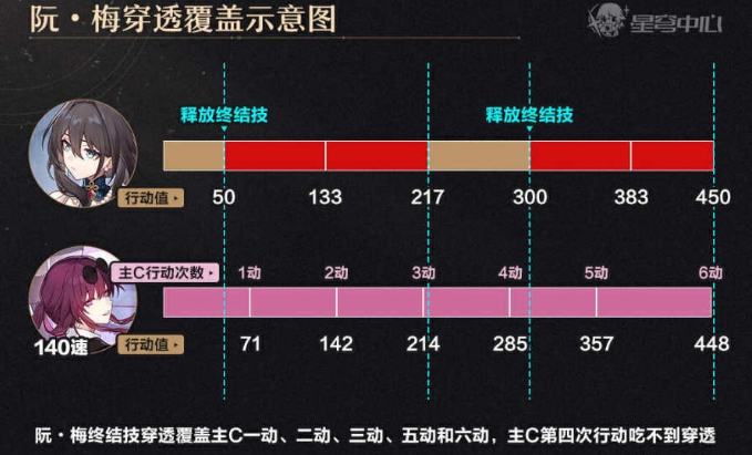 阮梅120速(触发翁瓦克拉条buff的最低速度),C位140速(原本130速左右,被阮梅天赋加速到140),两者的行动轴如下图所示,在4回合的战斗中,阮梅行动了5次,C位行动了6次,其中5次行动都吃到了阮梅终结技的穿透buff