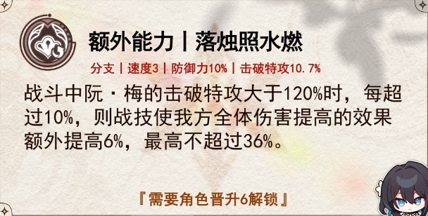 1.阮梅行迹额外能力「落烛照水燃」能根据击破特攻属性额外提高战技的增伤。