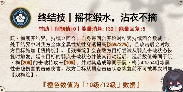 残梅绽伤害=终结技伤害倍率×[阮梅的等级基数×冰属性击破倍率×(1+阮梅的击破特攻)×(敌人最大韧性长度单位+2)÷4×易伤乘区×防御乘区×抗性乘区×各个减伤乘区]