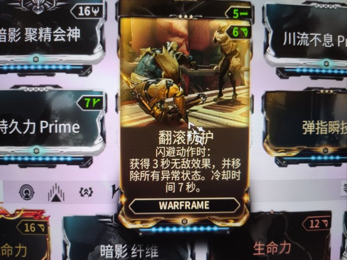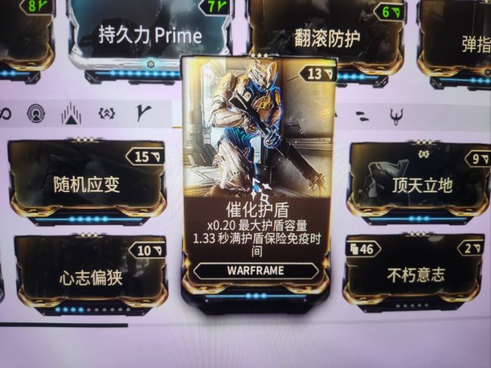 以上两个战甲无论选择哪一个都尽量拉高技能效率,战甲蓝量来保证吃到磁力异常状态后蓝量够继续释放技能保命;都装上翻滚防护,催化护盾两张卡:
