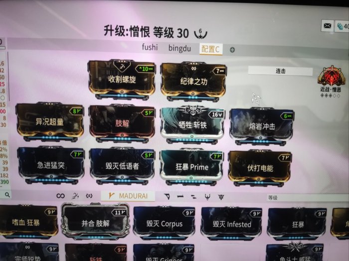 如都选择连击气解类近战配卡方面基本大致相同,下面以憎恨为例: