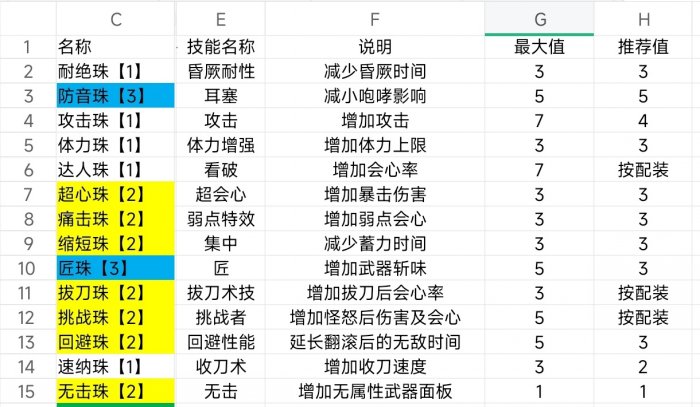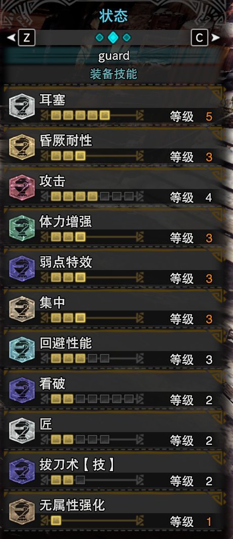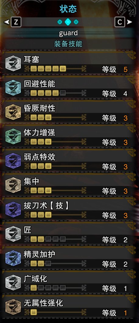 因为主线进度不同装备就不展示了,主要领会技能配置需求,对于我的习惯来说单人通刷至少保证3体力、3耐绝、3-5的耳塞、3弱点,另外发现回避性能对我帮助极大,冰牙龙0猫通过基本靠它,建议至少2,能堆高的话容错率很好,其他的看武器和特定怪去配就行,比如我用大剑需要集中3和拔刀就可以,看武器白斩的情况可以配2-3的匠,无属性的武器可以用无击,前期看破和攻击只能随缘,珠子又少孔也少这些凑完也没多余的,个人觉得新手保命比打伤害重要,活下来才有输出。
