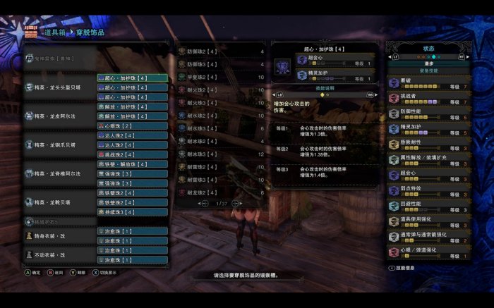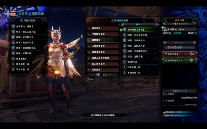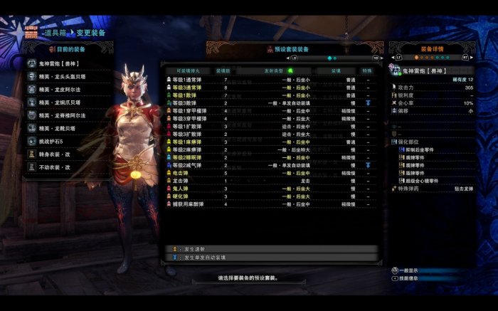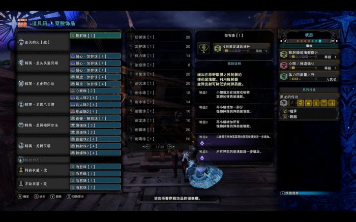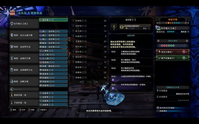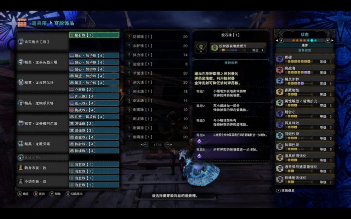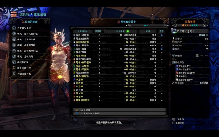 推荐的装备技能:复合珠顺带的精灵加护或整备;防御性能1、3、5;投射器装填数强化1,怪物倒地能更好地使用机关龙弹。