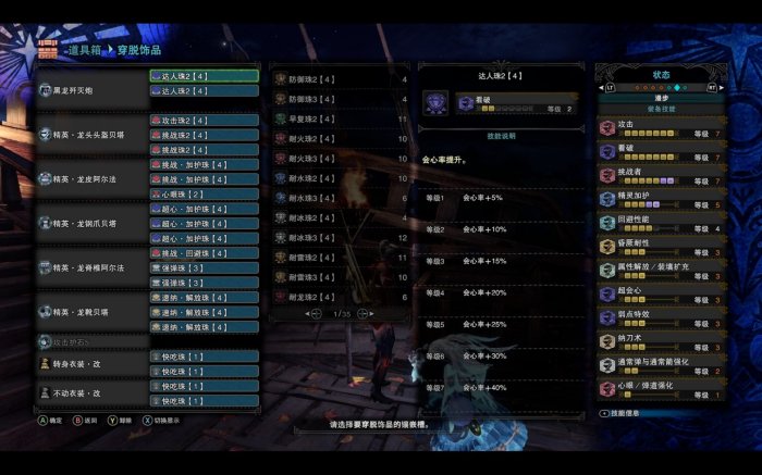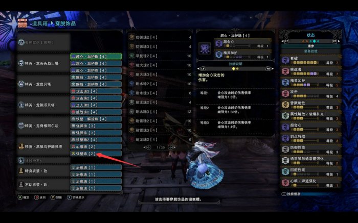 推荐的装备技能:复合珠顺带的精灵加护或整备;防御性能1、3、5;对自己有信心的可以仗着吸血使用无伤3。