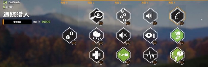 “追踪知识”,3级点满。这个技能最为关键了,尤其是2级时能让你调查动物血迹时,显示它当前大致百分比血量,很重要的技能。通过动物百分比血量下降速度,也能看你这枪打得到底行不行,还要不要追。必点技能。