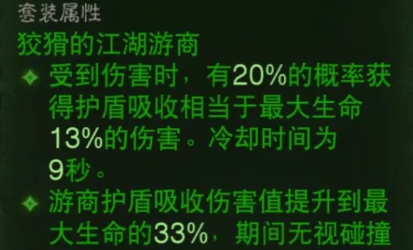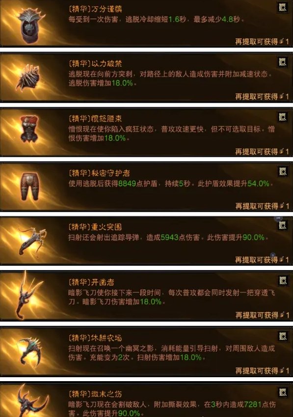 如果你觉得护盾足够,操作够细腻可以选择不带江湖游商,带4维图增加持续时间,受益的精华有暗影飞刀、憎恨、逃脱的护盾持续时间等等也算是高收益,同时附加增益状态给的急速提升也可以增加我们单体或者进人群爆发的强度。