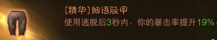 新逃脱搭配了裤子给护盾、个人是推荐盾的,因为这套玩法我们几乎是贴脸打伤害所以脆皮猎魔人护盾是保命增加容错率的关键。