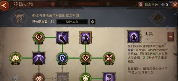 看完了救星的介绍我们来看看和救星类似的天赋——不败之地【生机】,相信前者已经是PVP的经典天赋了,哪怕策划在不断推全新的百夫之长、久经沙场、大地守卫、甚至是灾厄6的扬长避短(据说是非常强力的PVP天赋)不败之地依然是平民玩家的首选。