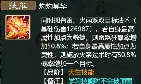 最高属性是敏,有概率增加雷法狂暴率;自身最高属性是灵性,则有概率增加1个目标。