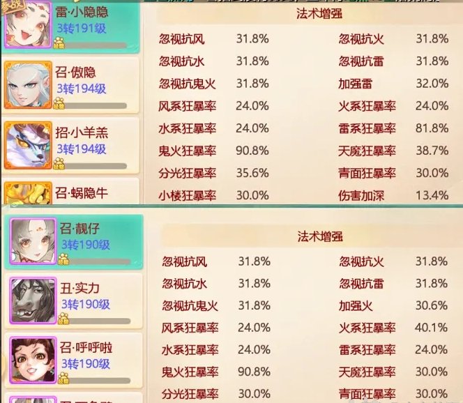 雷法召唤兽比较少,特殊召唤兽只有小颜如玉,这点非常重要。小颜如玉敏属性加点,雷法狂暴与鱼龙舞火法狂暴概率几乎一致。