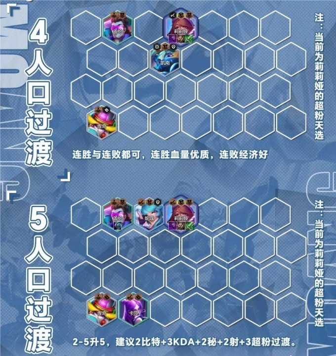2-1升4,2-5升5人口,有啥天选就用啥,建议带泰坦比较优质的或超粉过渡,建议开2比特+3KDA+2秘+2射+3超粉。