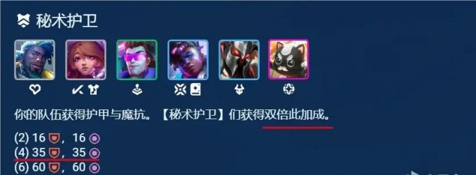 阵容与刀锋不同的是开4秘术羁绊,4秘能给全员增加35双抗,这样前排棋子基本都是100+双抗,阵容坦度会非常高,能给锐雯与佛耶戈争取更多的输出时间,收益非常高。