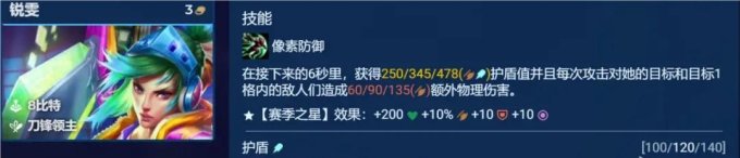 锐雯属于纯物理输出棋子,其本身技能就带护盾,生存能力较高;且开启技能后6秒普攻附带中等物理物理群体伤害,2星的时候输出强度就比较不错,中期锁血能力较高。