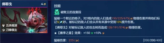 阵容的副C选择的是佛耶戈,其也是纯物理输出棋子,技能不仅能造成高物理群伤,关键是还能有10%的易伤,大幅度增加阵容的输出强度。而如果有8比特转职给予佛耶戈,能开出68比特的情况下,佛耶戈的输出强度更是直接拉满,搭配锐雯能快速清屏。