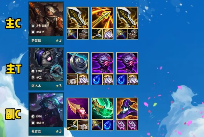 这套核心就是放弃瑟提波比这类斗士舞者前排,给莎弥拉开出4裁决基础上补4护卫,依靠4护卫在低于50%血量时,互相给临格护卫加基于自身40%最大生命值的护盾,把更多散件倾斜到后排裁决位上,3暴力符文+4裁决双无尽莎弥拉就是老版阿克尚