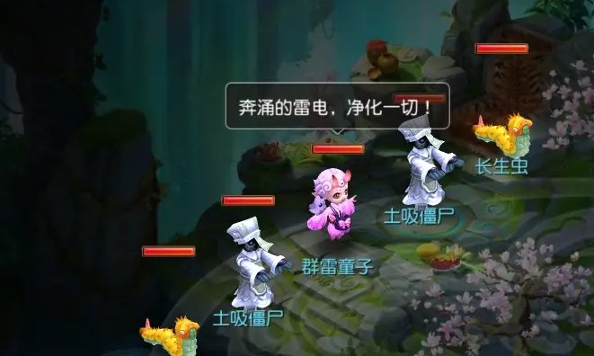 群雷童子伤害较高,所以优先进行集火击杀(如果带的是非泰山压顶技能的法宠则点着土吸僵尸集火)
