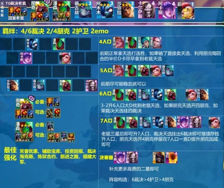 老鼠三星后上7人口,朋克天选开4朋克,可以停留在7人口一直d来增加朋克属性,如果裁决天选开出6裁决,因为2朋克加成很低所以存钱升级即可