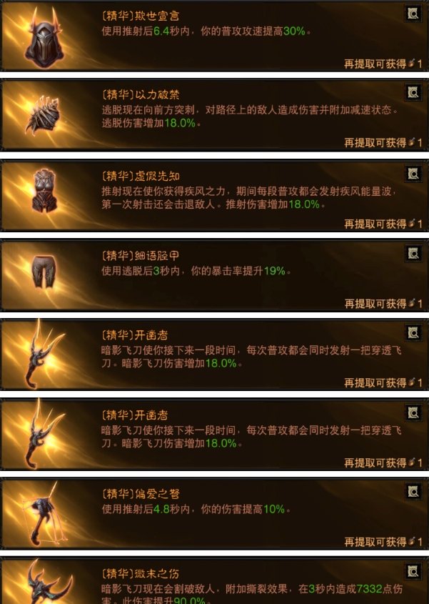 这套BD比较适合日常打野、找隐秘、做悬赏等等,并不适合副本魔神,毕竟少了一个输出技能。特点是利用了全新逃脱代替绳索射击做位移,同时逃脱后还有一个暴击加成的小爆发。狩猎之眼可以帮助我们更好的寻找地图路线同时给移速加成快速看到精英怪首领等等找隐秘是最好用的技能了。其他部位依然是飞刀+推射两大输出拉满,选择了移动射击主手只能用开凿者。