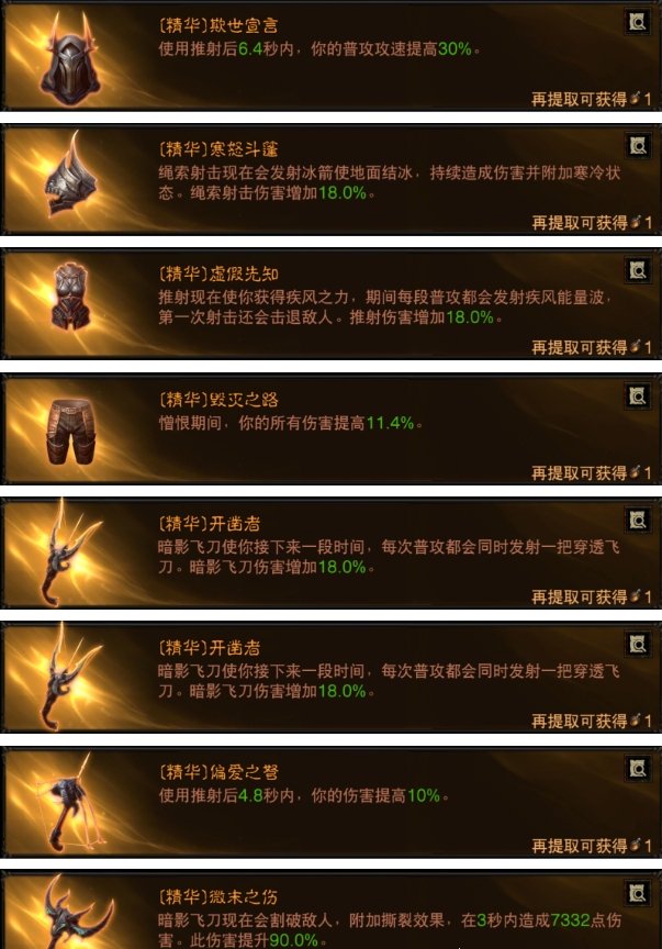 这套就是最经典的推射+憎恨+飞刀的3BUFF流猎魔人,玩起来也很丝滑,带了一个绳索射击做位移,绳索射击这个技能在官方的一次又一次改动后已经没有那么多后摇感觉。边走边打BUFF全开就是干,缺点是无法触发风火助威,同时主手精华也只能用一个开凿者,期待未来版本补上这个关键的拼图!