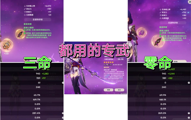 两个雷神都是用的专武来测试,绝缘套。技能都是拉满的。(面板上圣遗物差别在很难做到完全一致,只能尽量配平。爆伤差距1.6%,充能效率差距18%左右。)后面的伤害比较都是基于这样面板得到的数据。