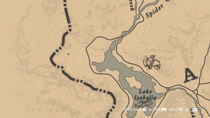 具体位置在地图左上方 伊莎贝拉湖(地图标识Lake Isabella)上游西岸,一般在图中标记位置附近刷新